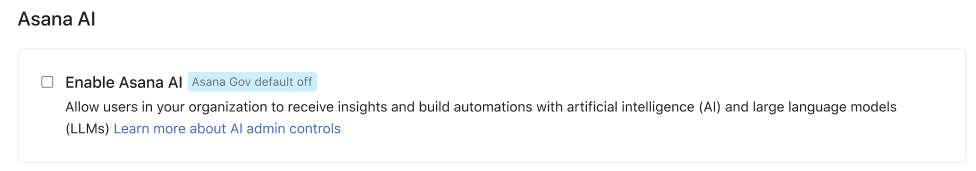 W przypadku klientów Asana Gov wszystkie funkcje AI są domyślnie wyłączone, ale można je włączyć, nadal spełniając wymagania FedRAMP. Aby włączyć funkcje Asana AI, wymagane są uprawnienia superadministratora.