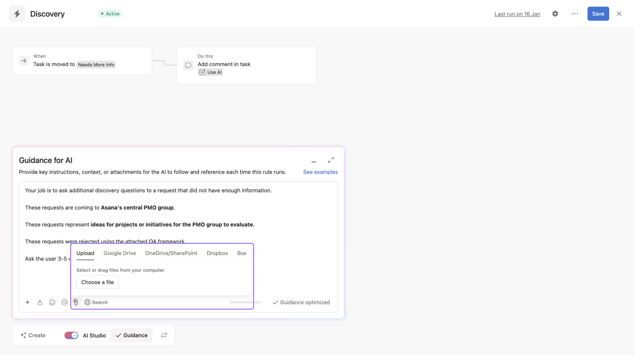 This feature is currently available within AI Studio, allowing Asana AI to read attachments from Google Drive, OneDrive, Sharepoint, Dropbox, and Box. Attachments can be read by Asana AI when attached to the input task (the task which triggers the rule) or when attached directly to the Smart workflow instructions.