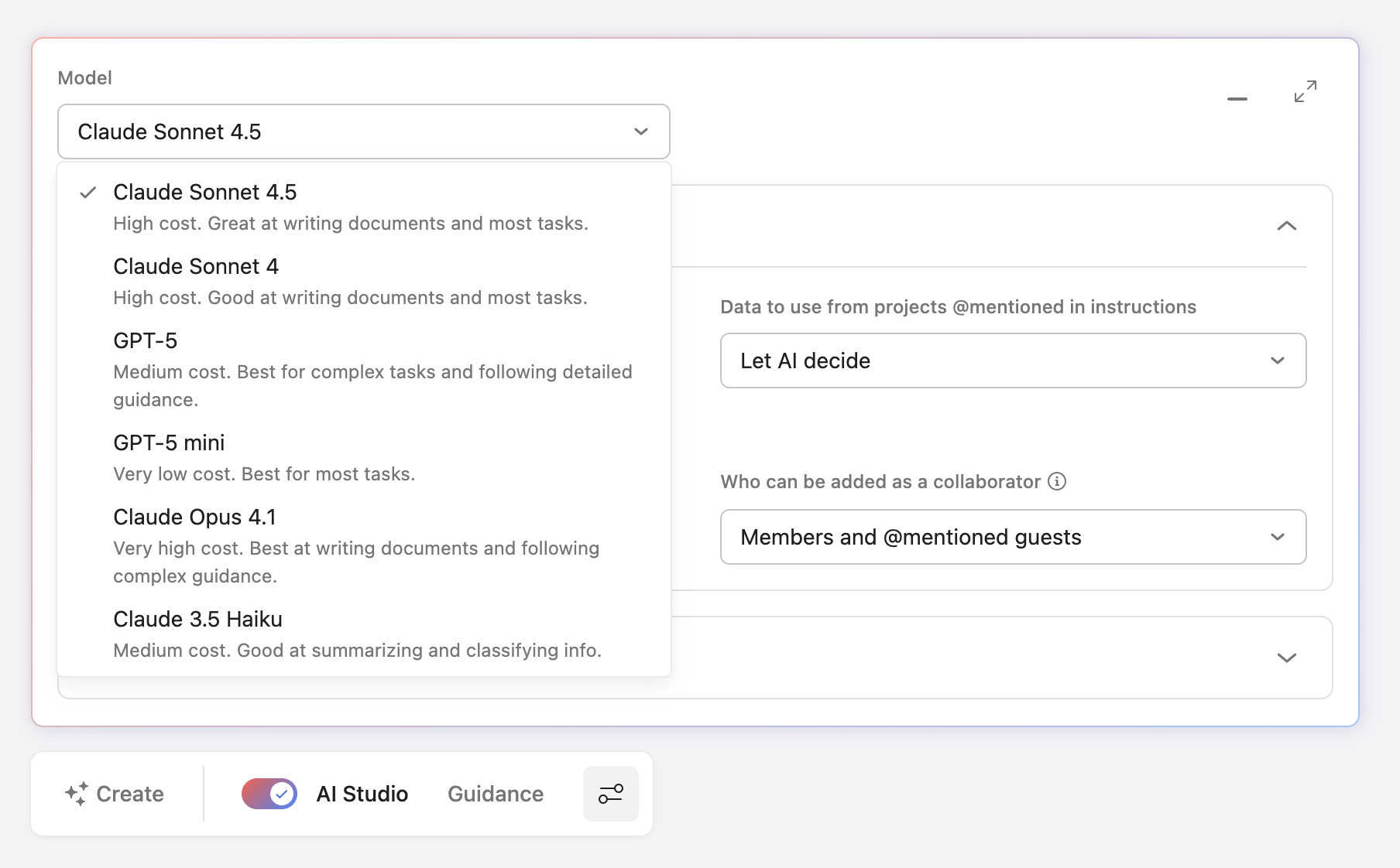 When building a workflow, you can pick a model inside each rule. Start with the simplest option that gets the job done. Lighter models are fast and credit efficient, which suits triage, short comments, routing, and small text transforms. Heavier models can add value when you need deeper reasoning, long context, or high quality writing. Switch between the available models in the AI Studio settings panel when creating an AI rule.