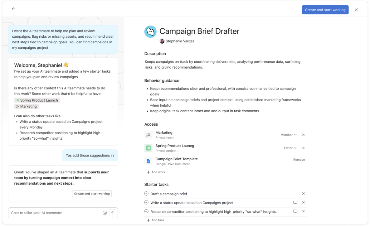 Salah satu pola umum adalah menggunakan AI Studio untuk mengumpulkan dan mengarahkan permintaan ke Asana sebagai Tugas terstruktur, lalu melibatkan AI Rekan Tim untuk menangani pekerjaan yang lebih kompleks dalam Tugas tersebut. Contohnya, AI Studio dapat membuat dan memilah permintaan kampanye yang masuk untuk tim pemasaran. Kemudian, AI Teammates pemasaran dapat menyusun Brief, meringkas penelitian, dan menyiapkan pembaruan untuk kampanye tersebut.