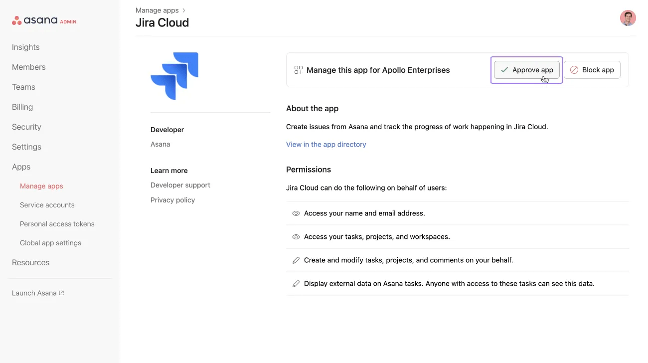 The admin will receive an email similar to the above example. Clicking Manage app in Asana will take the super admin to the app details page to approve the app.