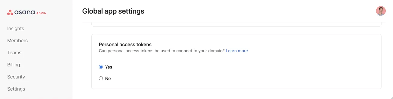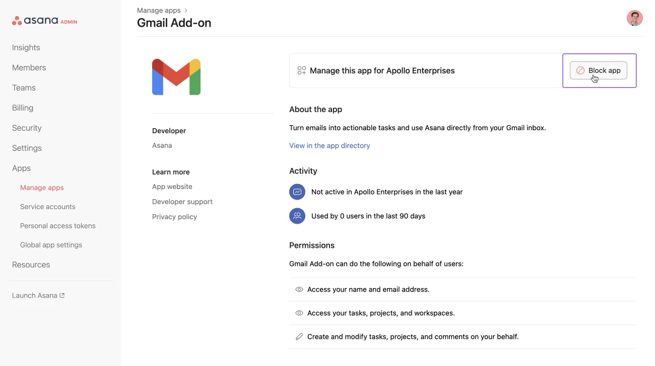 Customers retain full control over the availability of App Integrations. Authorized admins with access to App management may configure domain-wide preferences directly in the admin console. Organizations without these controls may restrict user access by contacting Asana Support.