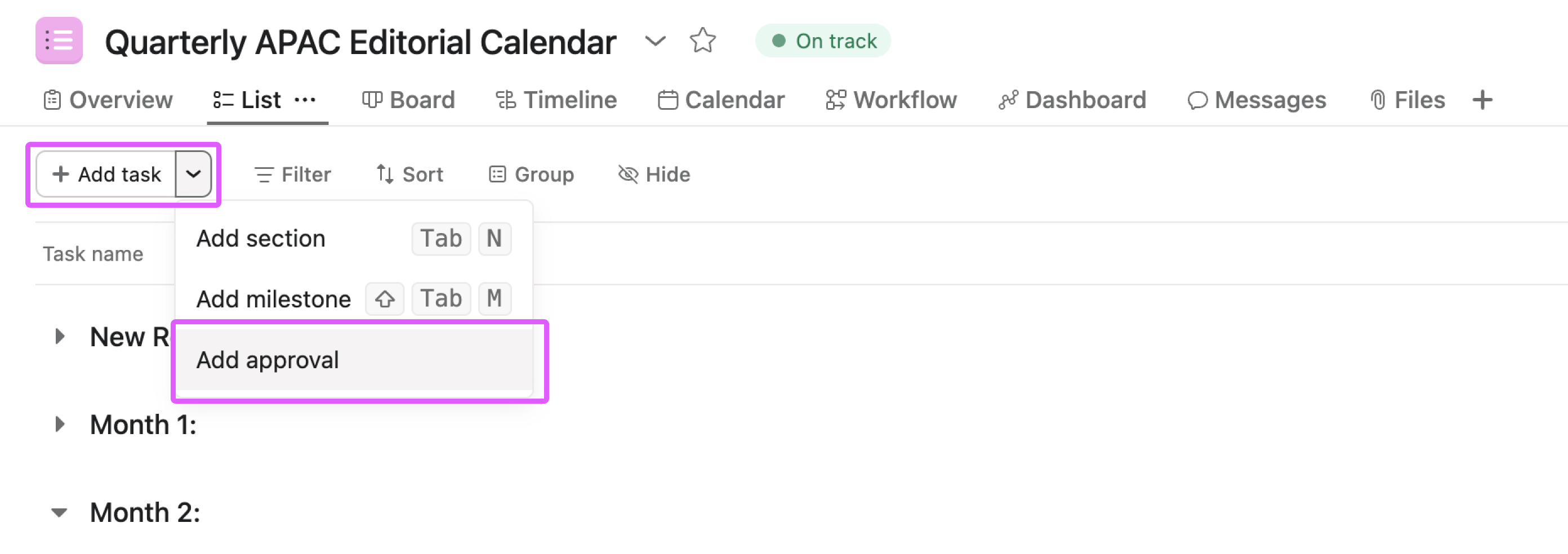 The quickest way to create a new approval task is to use the + Add task button in the top-left of your project, and select Add approval.