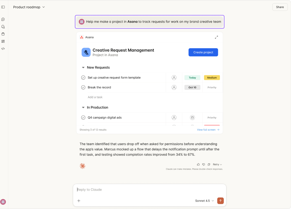 The Asana app in Claude brings your work graph directly into Claude conversations, allowing you to turn AI-powered discussions into actionable work without leaving Claude.