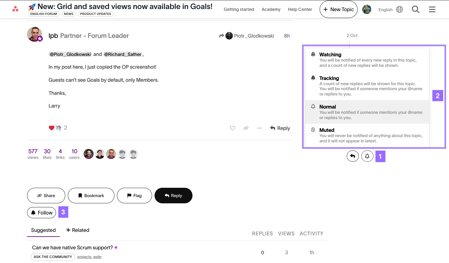 Marca las publicaciones para ayudar a mantener el Foro de la comunidad de Asana seguro, organizado y fácil de navegar. Al marcar una publicación, se notifica al Equipo de moderación para que pueda revisarla y tomar las medidas adecuadas.