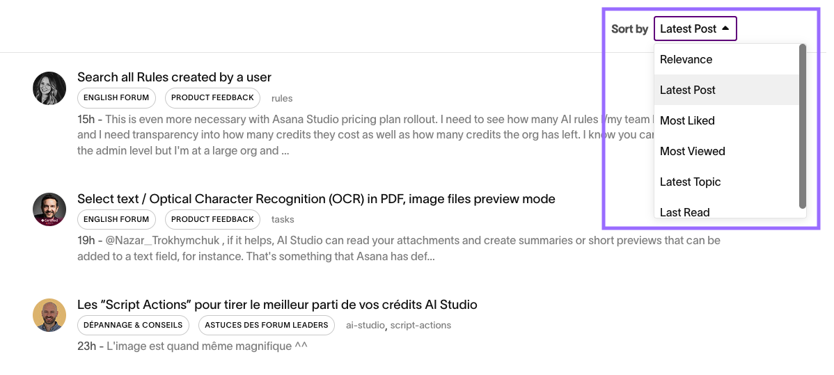 Ordena los resultados para identificar los hilos relevantes. Por ejemplo, ordena por Publicación más reciente para mostrar los temas más recientes.