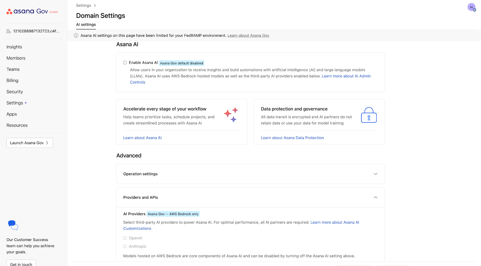 Funkcje AI są domyślnie wyłączone w Asana Gov. Superadministratorzy mogą w dowolnym momencie włączyć lub wyłączyć funkcje AI za pośrednictwem Konsoli administratora.
