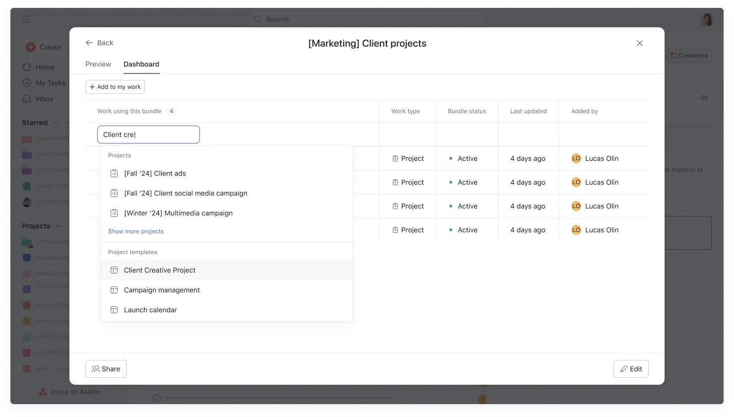 - Click the + Add to my work button to search for and select the relevant project template.