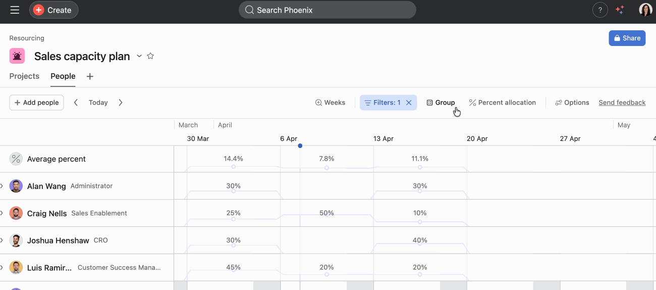 カスタムフィールドに基づいてキャパシティビューをグループ化すれば、仕事の割り当て状況を把握できます。グループ化は、基礎となる割り当てを変更せずに、チーム、役割、またはプロジェクトカテゴリ間の不均衡をすばやく特定し、キャパシティを比較するのに役立ちます。