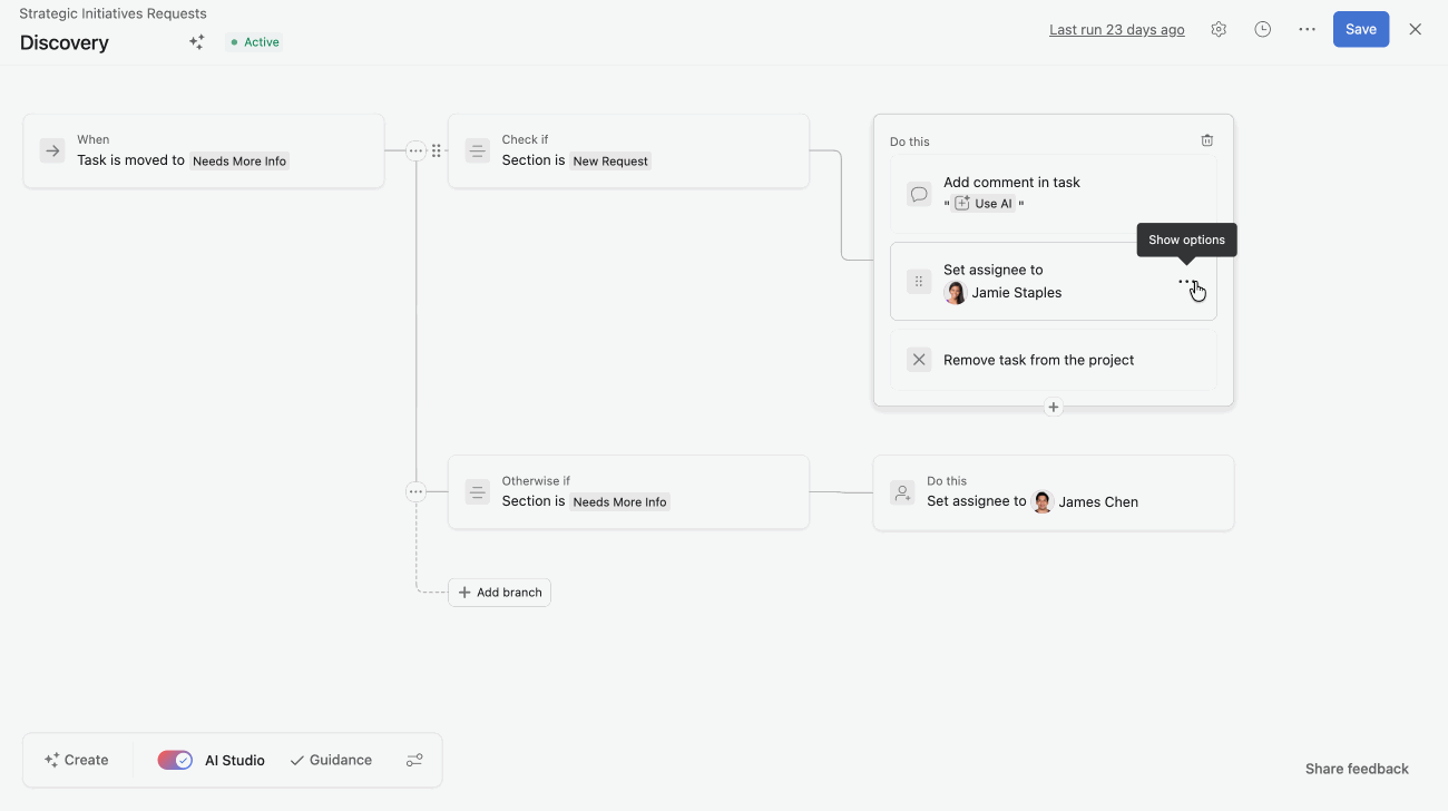 条件とブランチを使用すると、ルールの作成者はルールのトリガーと実行するアクションをより詳細にコントロールできます。Asana のルールビルダーを使用すれば、ニーズに応じてシンプルなオートメーションから複雑な構成まで柔軟に作成できます。
