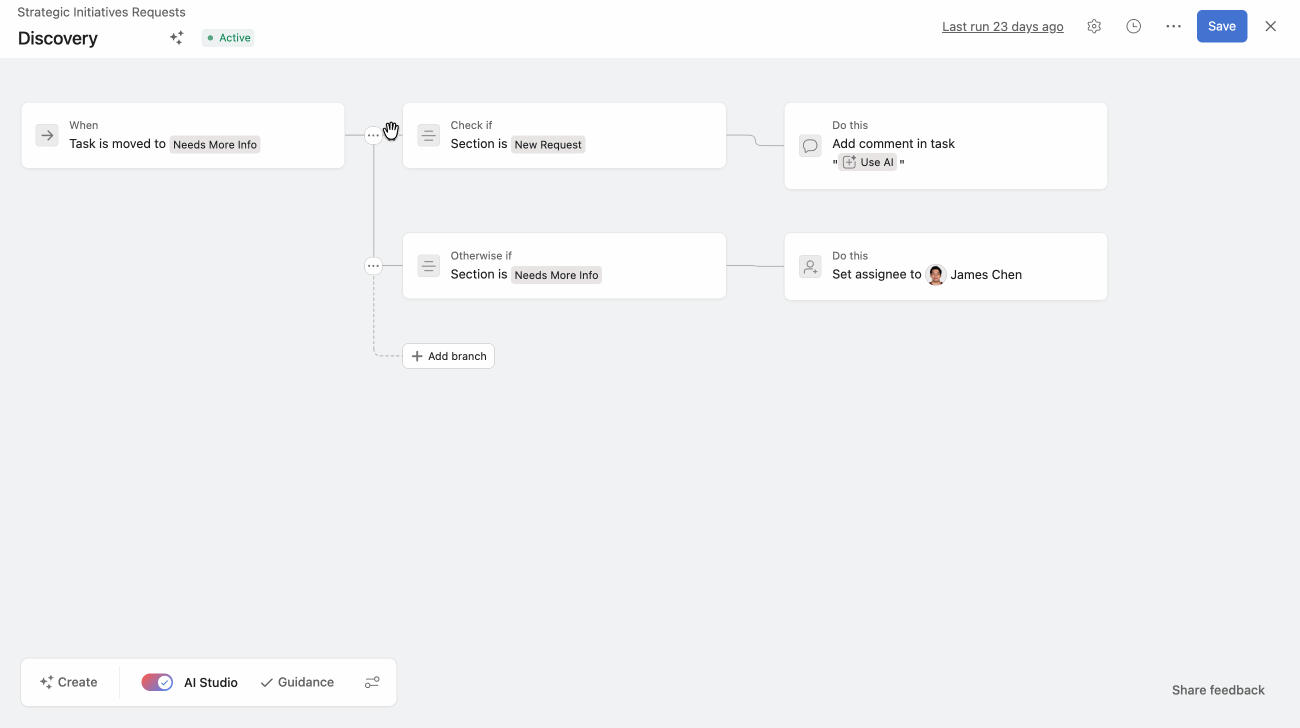 藉助條件和分支,規則建立者可以更好地控制其規則的觸發方式以及其執行的動作。Asana 的規則產生器可根據您的需求靈活建立簡單的自動化或複雜的組態。