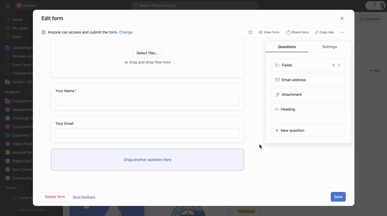 Formulare standardisieren, wie Anfragen übermittelt werden. Halten Sie Formulare kurz, indem Sie nur nach den erforderlichen Informationen fragen (z. B. Ziel, Fälligkeitsdatum, Beteiligte) und verwenden Sie dann bedingte Verzweigungen für Folgefragen. Wenn der Anfragesteller beispielsweise Video auswählt, zeigen Sie Felder für das Seitenverhältnis, die Skriptlänge und das Voiceover an.