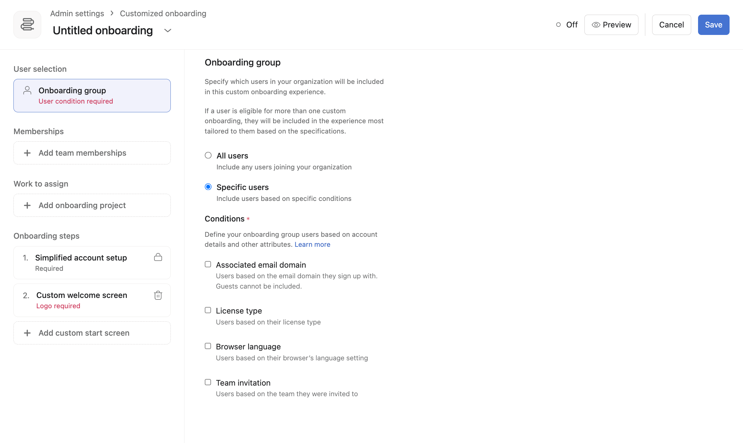 Custom onboarding consists of three main components: user selection, onboarding steps, and content to assign.