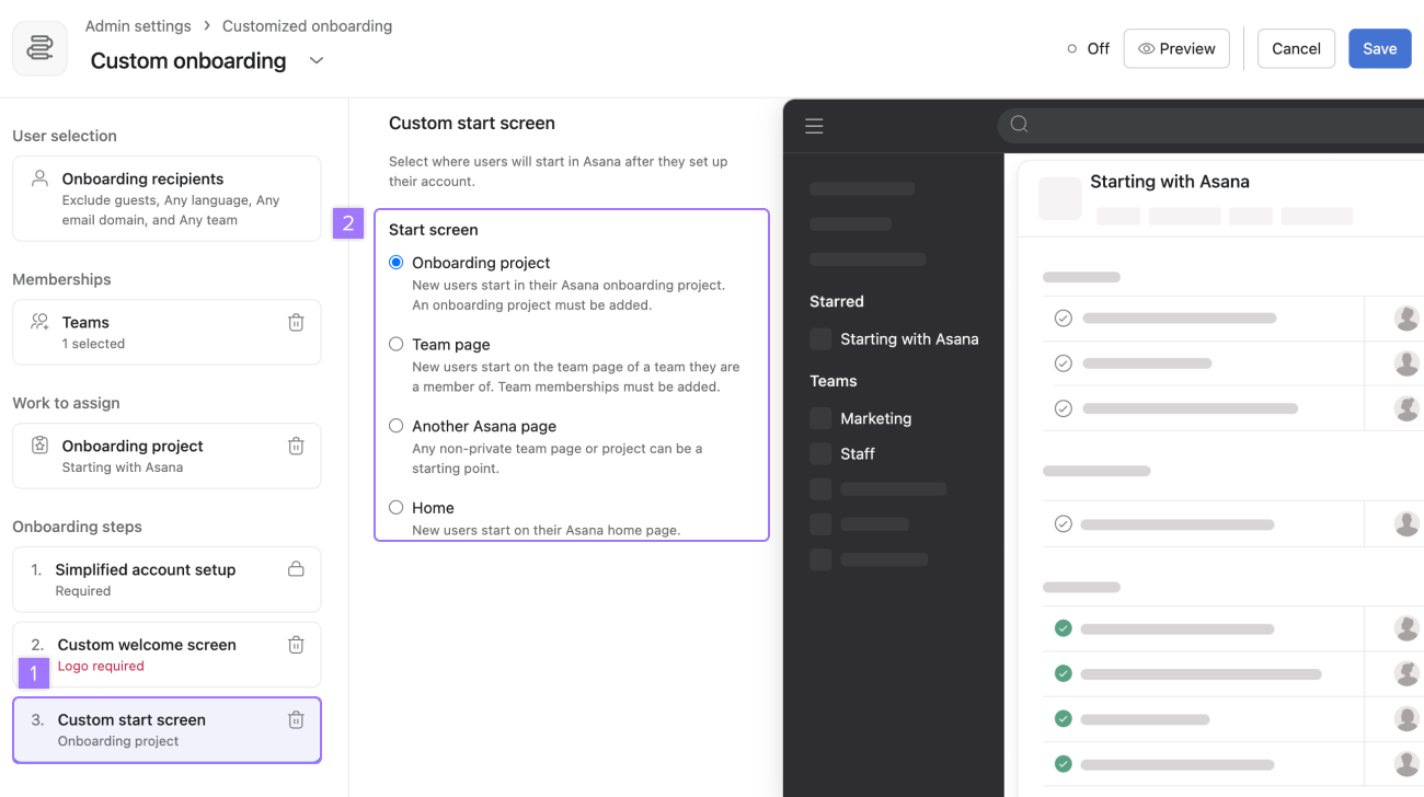 Questa sezione determina quali schermate verranno visualizzate dai nuovi utenti durante l’onboarding su Asana. Per impostazione predefinita, l’opzione “Configurazione semplificata dell’account” è attivata, il che indica che stiamo ignorando il Processo di onboarding standard per i nuovi utenti. Questo passaggio non può essere disattivato se abiliti l’onboarding personalizzato.