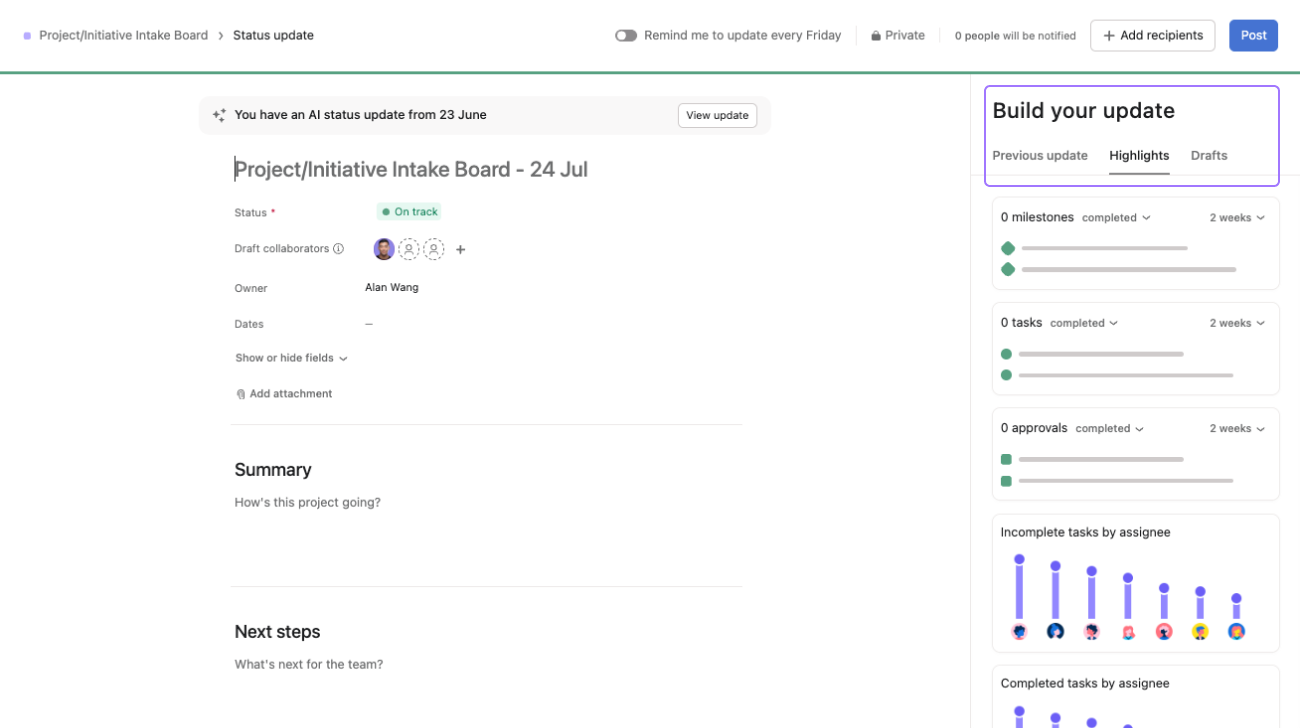 A medida que tu equipo da vida al evento, usa la pestaña Resumen para publicar actualizaciones de estado y ver la actividad del proyecto. Puedes arrastrar y soltar destacados en tus actualizaciones de estado para compartir gráficos e hitos. Asana guardará tu plantilla para actualizaciones de estado por si quieres continuar siempre con el mismo formato. Incluso puedes crear un primer borrador con la IA de Asana y la función de estado inteligente para acelerar el proceso.