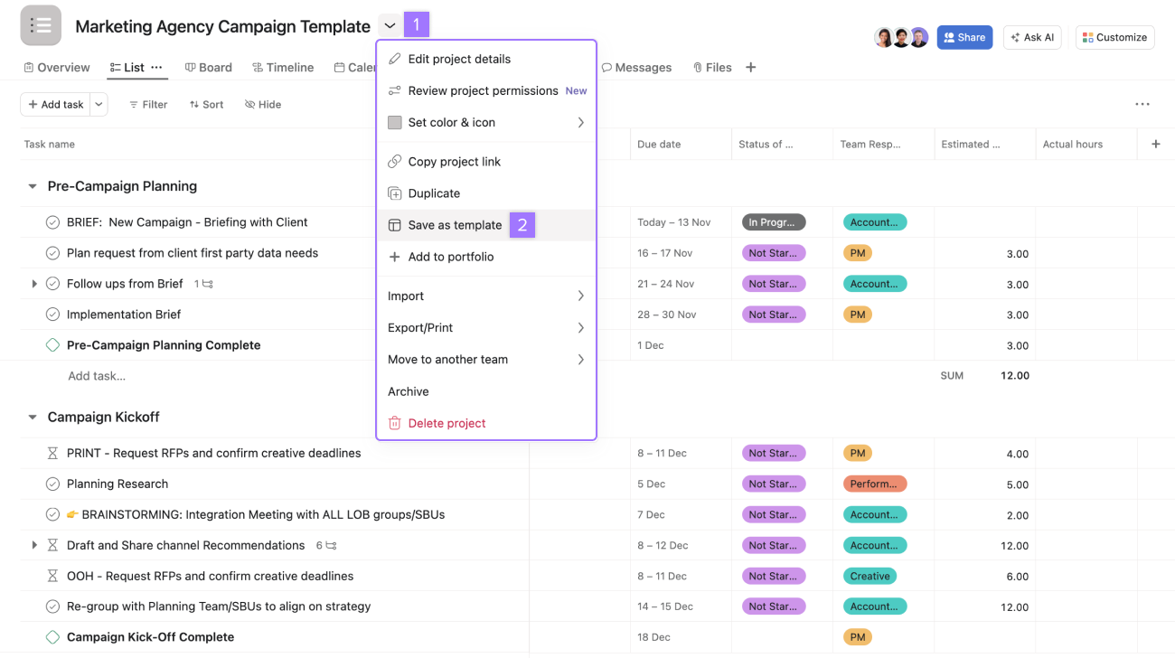 Cada evento es diferente, pero por lo general comparten una lista de verificación central. Para evitar perder tiempo volviendo a crear un proyecto para cada evento o guardando la información en un documento que no está conectado al lugar donde se está llevando a cabo el trabajo, puedes crear y guardar tu plantilla de evento en Asana. Convertir tu proyecto de planificación de eventos actual en una plantilla no solo te ahorrará tiempo en el futuro, sino que también te ayudará a no olvidar los pasos importantes.