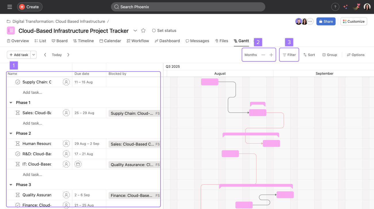 Gantt view equips project managers with the tools to visualize and manage project plans effectively, offering insight into task durations, delivery dates, dependencies, and baseline of your project plan. Gantt view is particularly valuable for large, structured, complex projects that require meticulous planning and comparison of original plans against real-time progress.