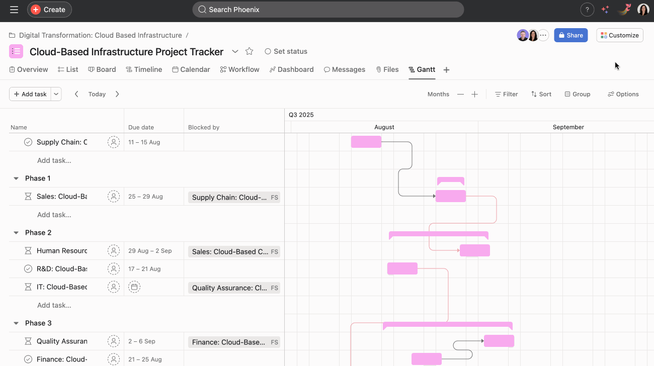 To view a project in Gantt view, you will need to add the view to your project. Once the view has been added, open your project in Asana and navigate to the Gantt tab.