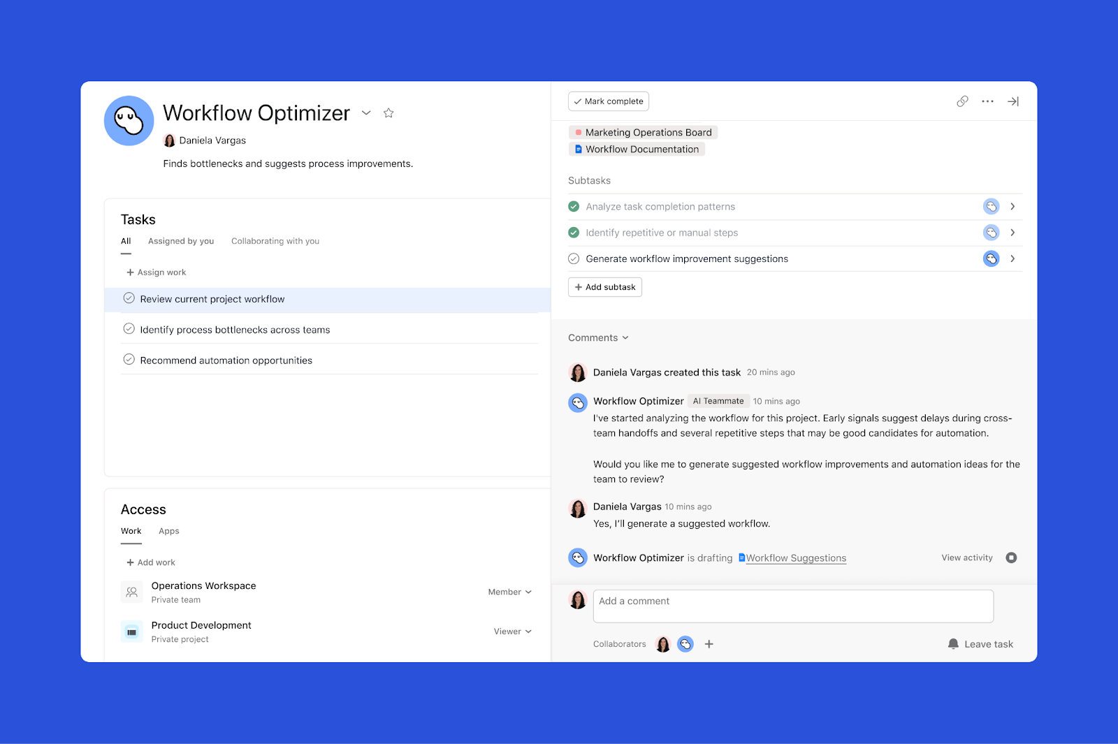 Zidentyfikuj wąskie gardła operacyjne, aby zapobiec nadmiernemu obciążeniu pracą ręczną, zanim się ono rozwinie. Ten członek zespołu wykrywa wąskie gardła i proponuje ustandaryzowane usprawnienia procesów lub automatyzacje na podstawie wcześniejszych wzorców realizacji zadań w Twoim zespole.