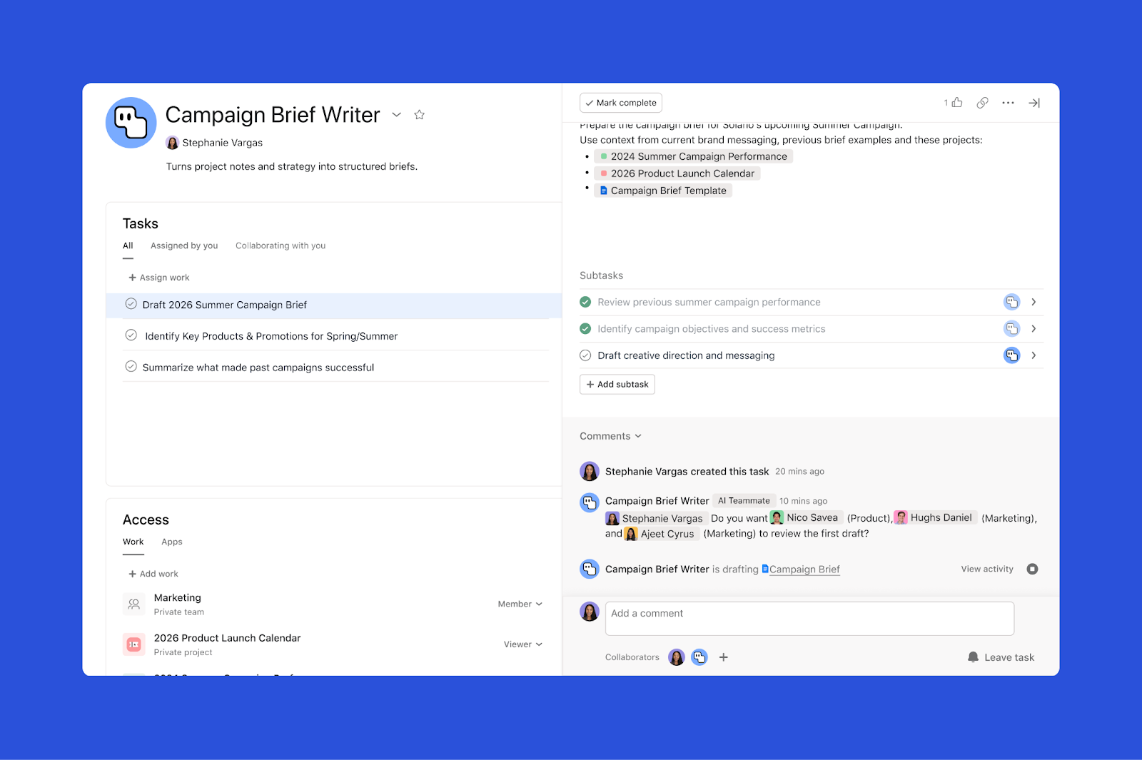 AI Teammates to prawdziwi mnożnicy siły, którzy wypełniają lukę między surowymi danymi a uporządkowaną realizacją zadań. Od przygotowywania briefów zgodnych z ideą marki po weryfikację specyfikacji technicznych – te wyspecjalizowane role dbają o spójność marki i terminową realizację zadań we wszystkich działach.