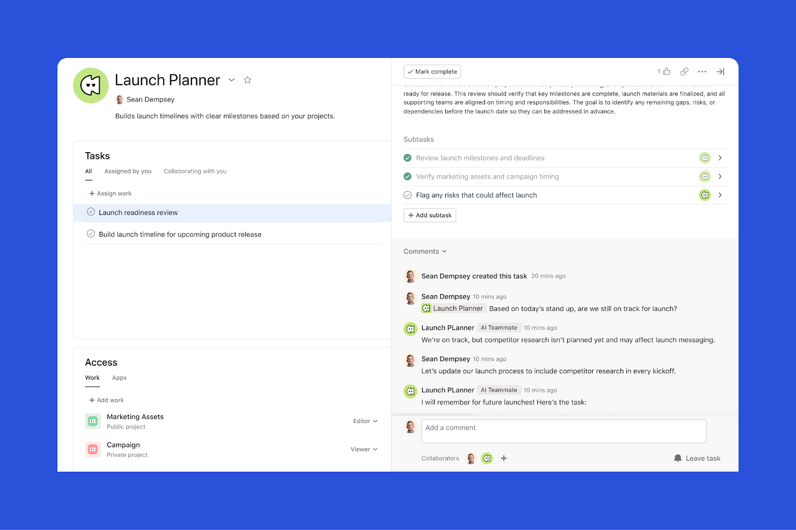 Na podstawie Twoich projektów tworzy harmonogramy wdrożenia zawierające jasno określone kamienie milowe. Ten członek zespołu zmniejsza obciążenie związane z ręcznym planowaniem, analizując analizy post-mortem poprzednich premier i zależności międzyfunkcyjne w ramach mapy drogowej premiery, która przedstawia jasną „drogę do sukcesu” i identyfikuje wszystkie istotne przeszkody, zanim zespół w ogóle rozpocznie pracę.