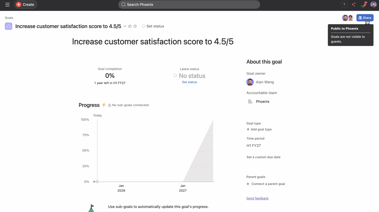 Dela mål med hela team i stället för bara enskilda personer. Dela mål med team för att spara tid och se till att alla i teamet är uppdaterade om målet.
