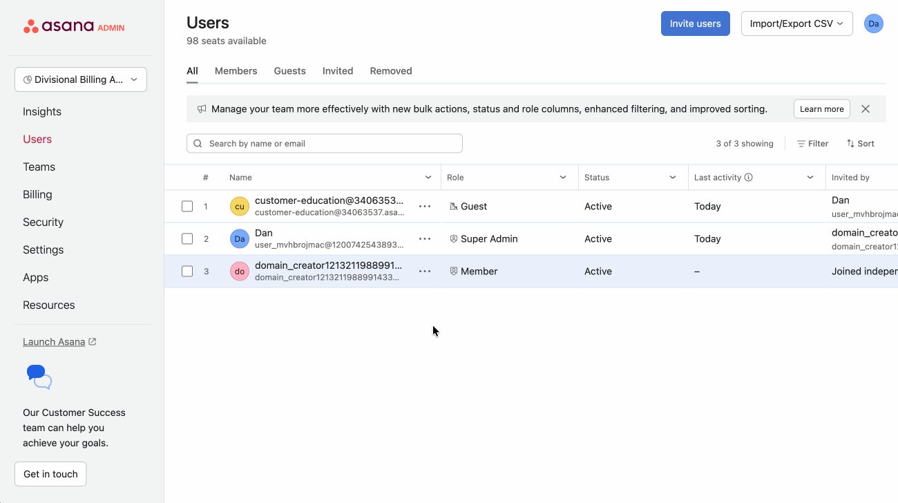 Division admins can remove users from their division through the Members tab of the division admin console. Removing a user from the division will not deactivate the user's account, nor will this action remove the user from the organization. Removing an organization member from a division will ensure that the member does not take up a space on a paid plan. Guests can be removed in the same way.