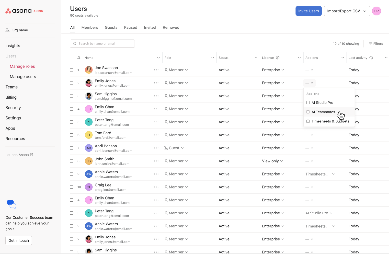 Om du vill licensiera och tilldela AI-teamkollegor i bulk laddar du upp en slutförd CSV-mall från adminkonsolen. I CSV-filen lägger du först till AI-assistenter för varje användare i kolumnen för tillägg.