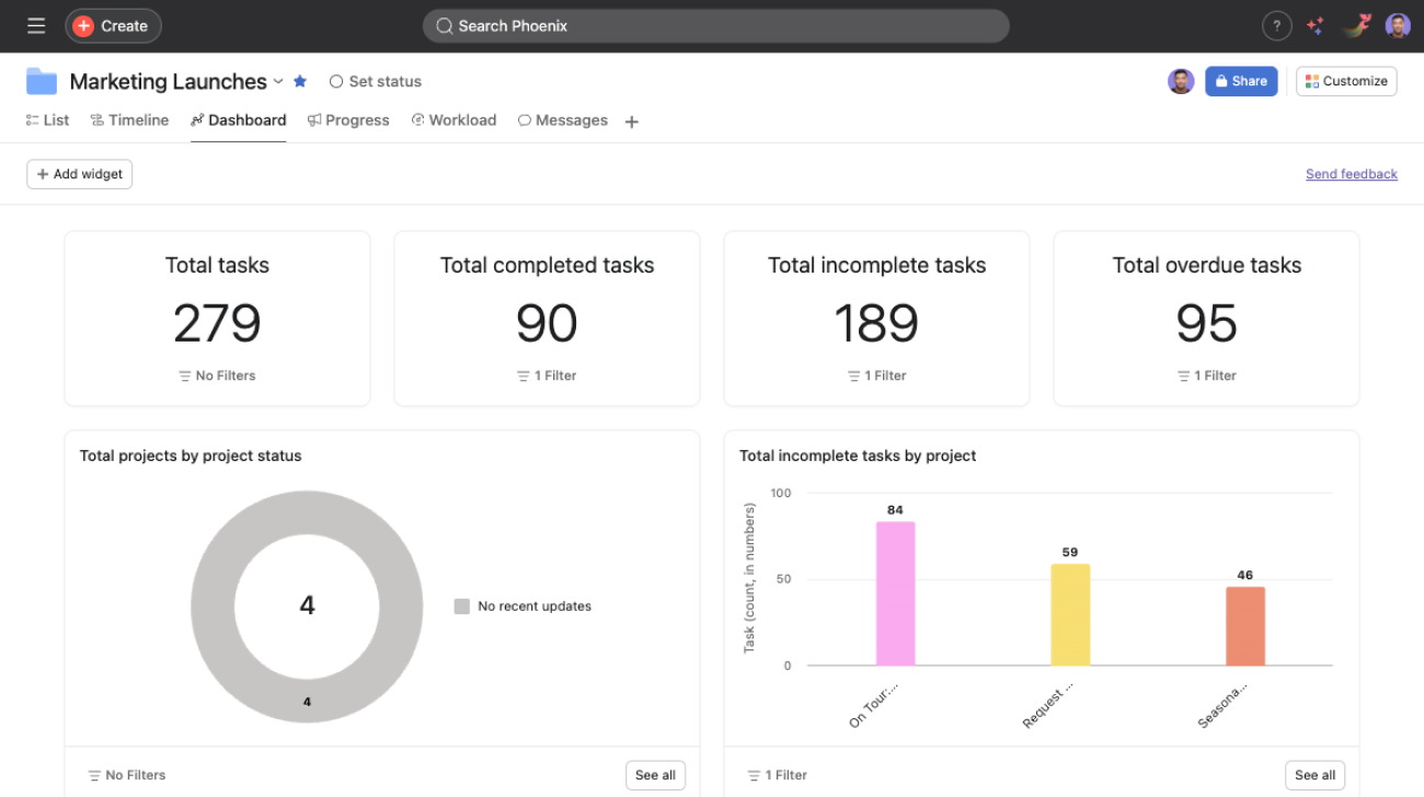 Add charts that pull from one or many projects, then refine with filters (assignee, custom fields, subtasks, and more). Share your dashboard with teammates or copy a share link to keep stakeholders aligned.