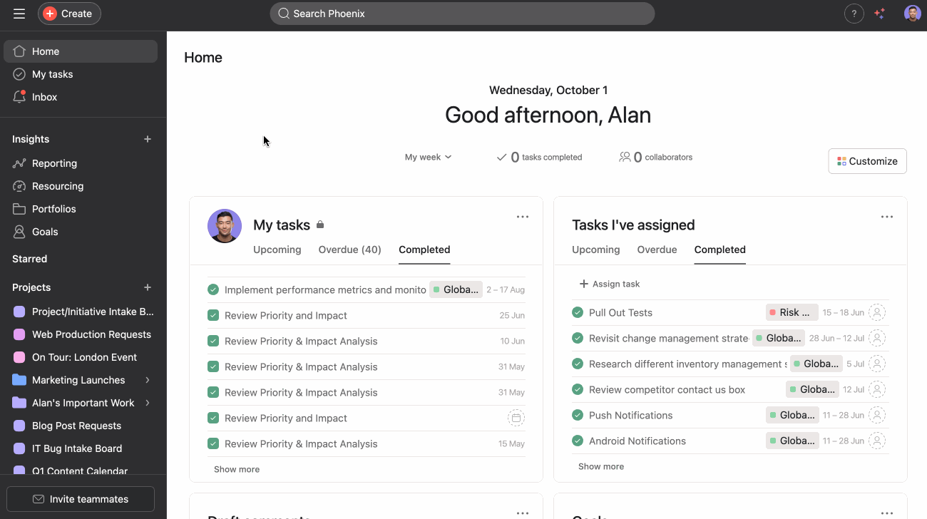 Don’t reinvent the wheel for each initiative. Create a “Strategic Initiative” template with standard sections (e.g., Discovery, Delivery, Launch), task templates, custom fields (e.g., Impact, Effort, Owner department), and default collaborators. Save your project as a template and share it across teams.