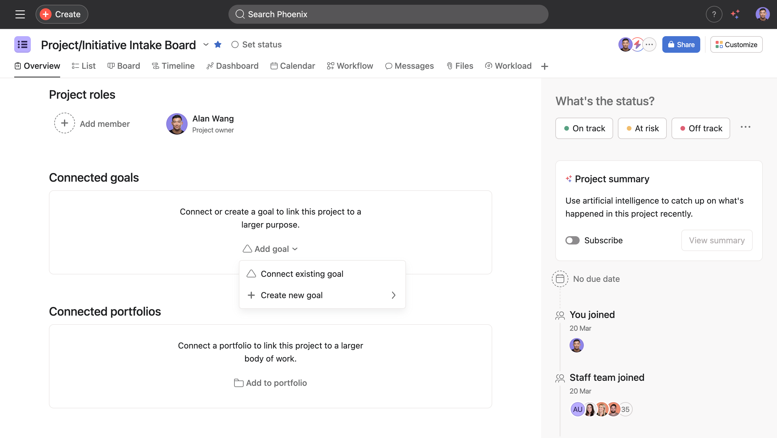A goal is only as strong as the projects that support it. From a project’s Overview tab, scroll down to Connected goals, click Add goal, and add the relevant goals. Project progress then contributes to goal progress.