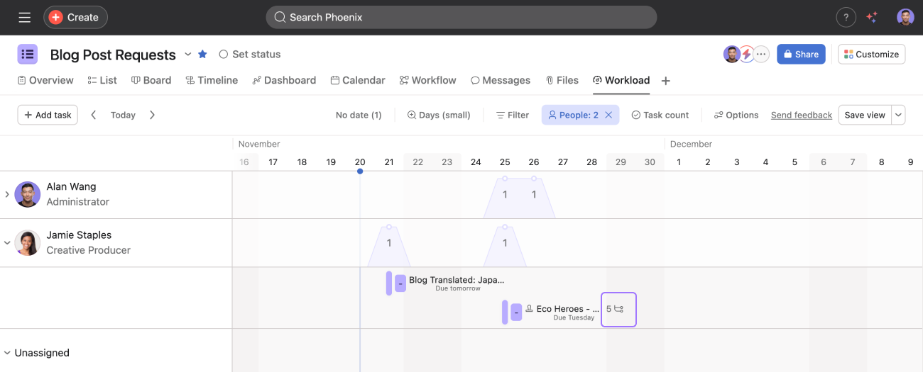 La gestión de recursos de portafolios y proyectos está disponible en los planes Asana Advanced, Enterprise y Enterprise+, y planes anteriores Business y Legacy Enterprise.