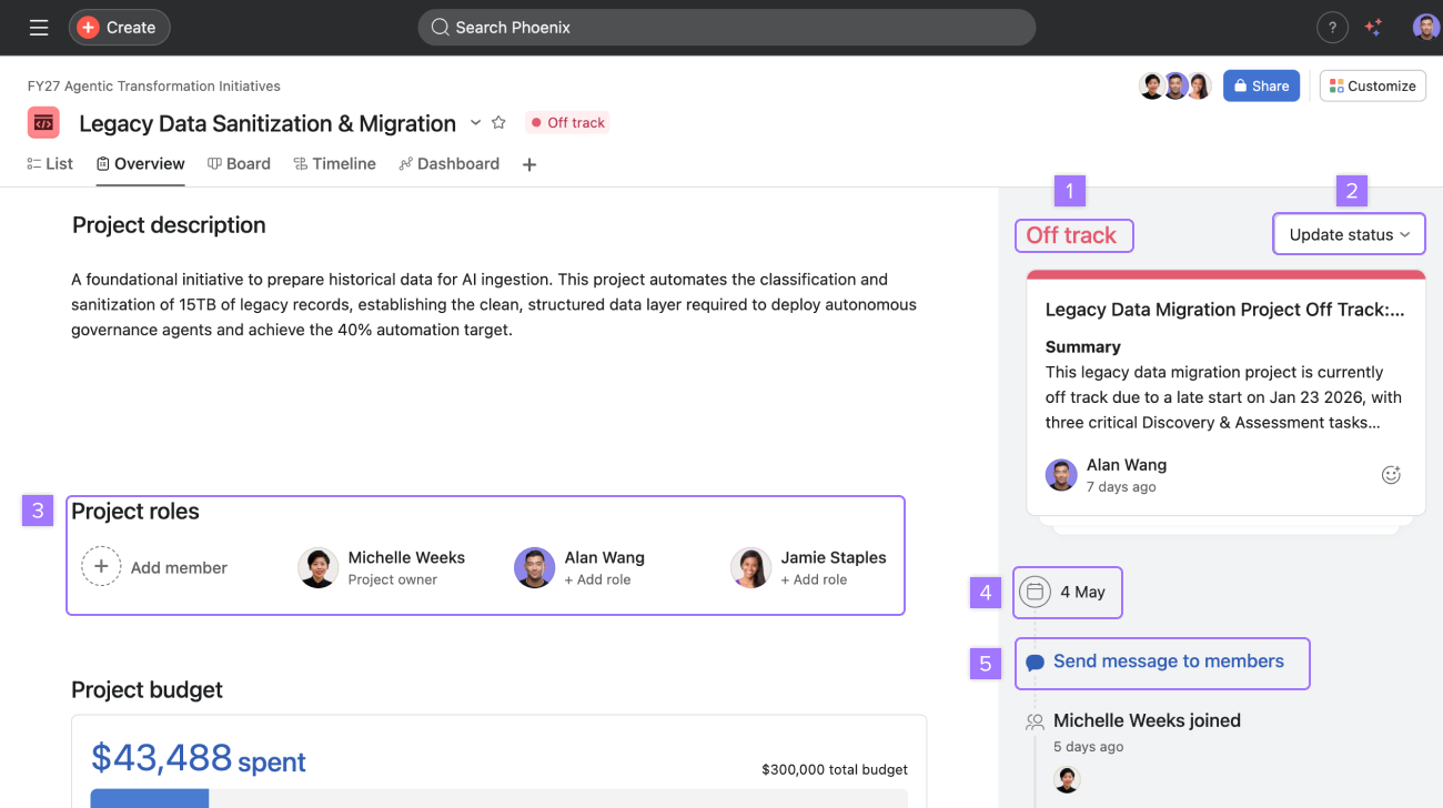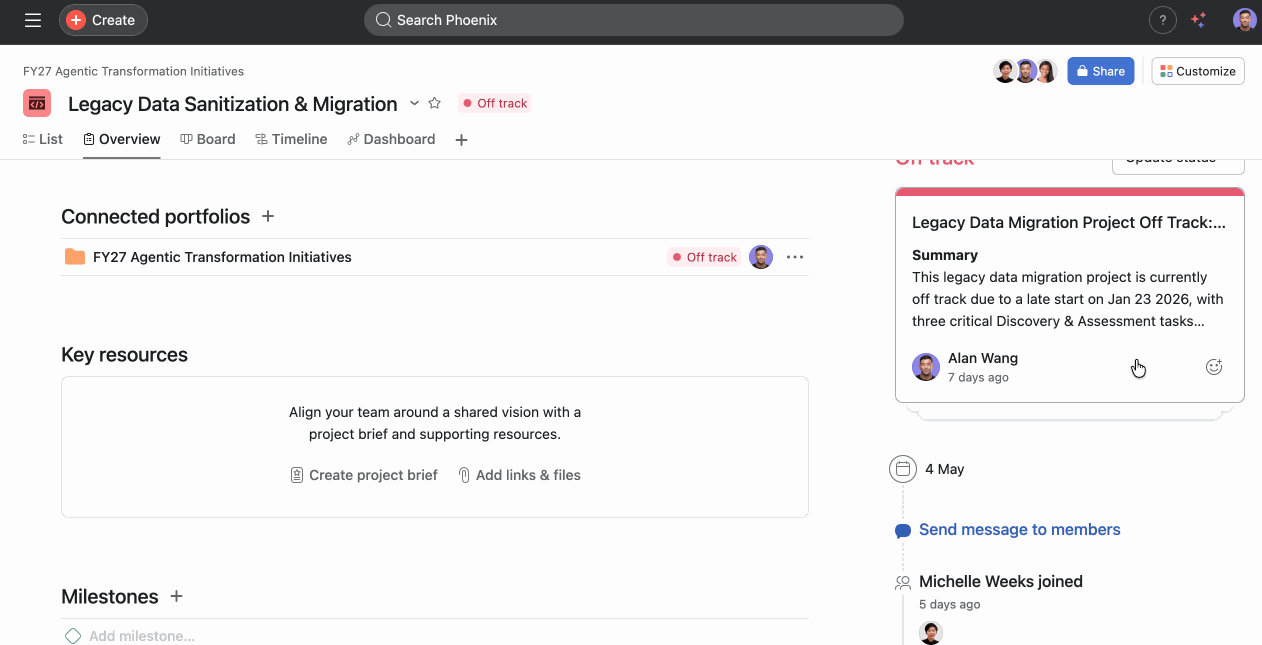 You can drag and drop highlights such as completed milestones or overdue tasks into your status update to help tell your story. Adding these highlights gives a visual insight into recent achievements or potential blockers for your Team.