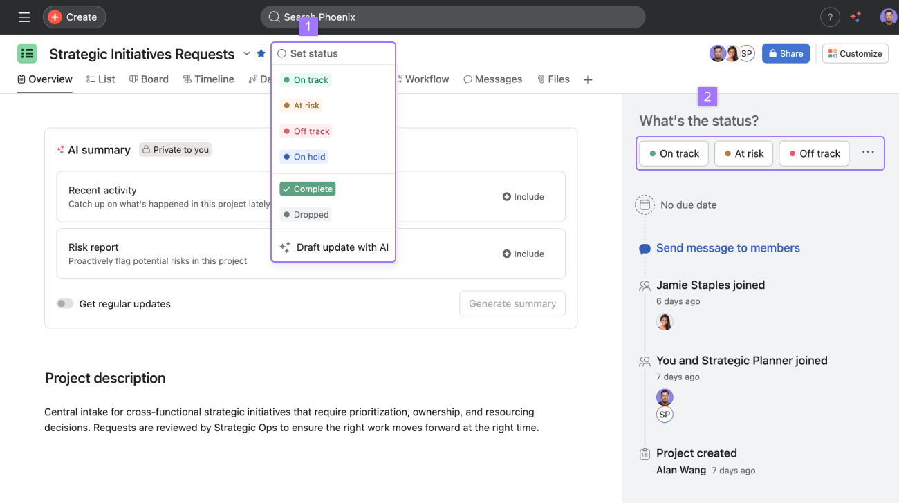 1. Check if the project is on track, at risk, off track, on hold, complete, or dropped