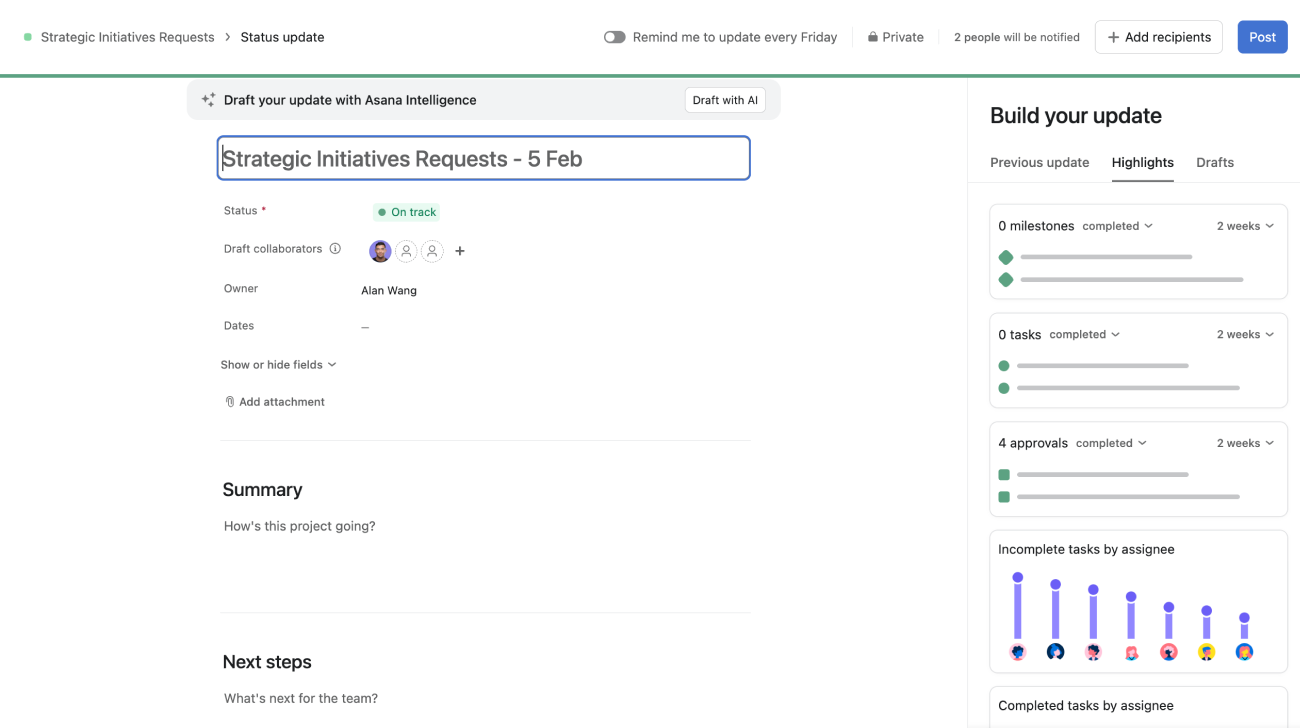 Once you’ve added your highlights and published your status update, Asana will remember the block structure and order for future updates.