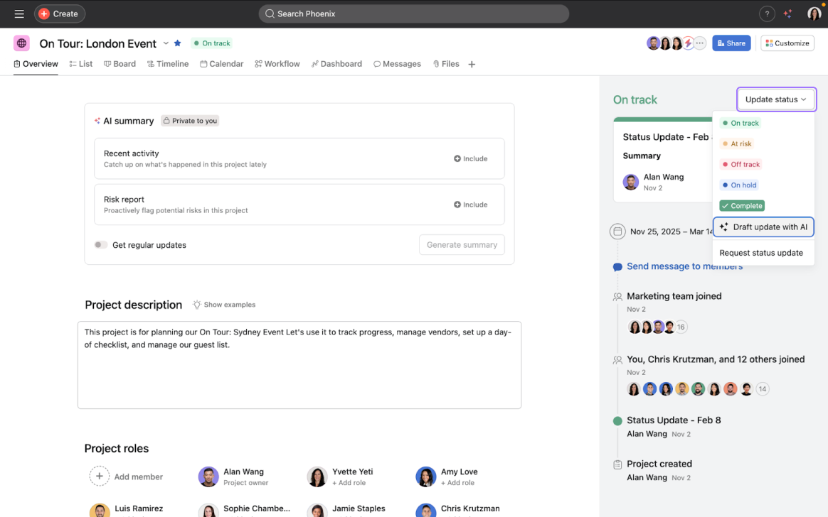 If you've recently been invited to a project, use Asana AI to summarize recent project activity.