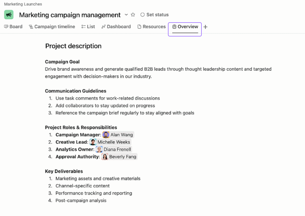 Project creators should outline the purpose and objectives of each project or initiative in the Overview tab. Additionally, you can define project roles, connect your project to team or company goals, and share key resources. The Overview tab gives project members the context they need to contribute effectively.