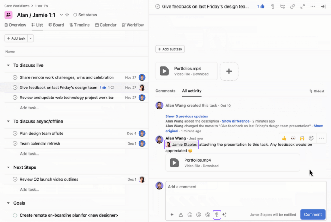 Collaborate in Asana with comments, messages, attachments, and @mentions, to promote effective communication among team members. Add collaborators, ask questions, and provide updates within tasks, projects, and portfolios. As collaboration happens, relevant stakeholders will stay in the loop with Inbox notifications.