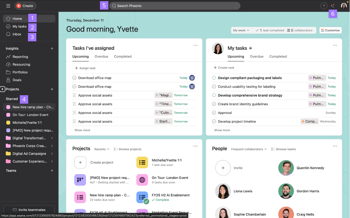 There are a number of key areas to know as you move around Asana: