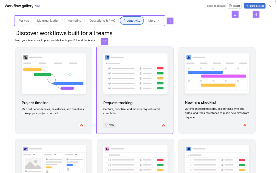 From the +Create button, select Project. Choose a project from the workflow gallery or create a new one. Name it based on a current or upcoming initiative—like "Website Updates," "Q1 Planning," or "Team Onboarding."