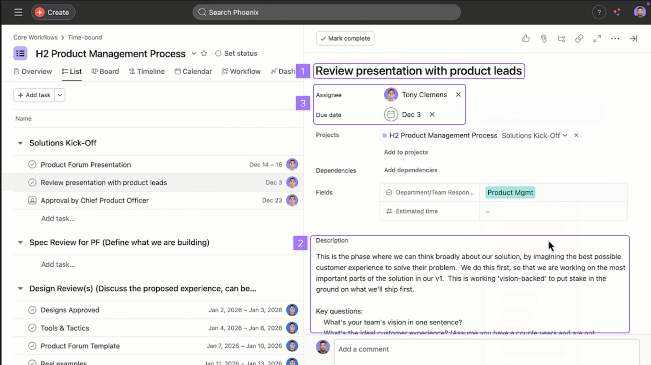 Use the task description to include all necessary details, instructions, and context so the assignee has everything they need to start and complete the work. Use Asana AI to improve formatting, alter description length, or adjust the tone.
