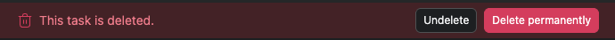 Después de eliminar una tarea, se te presentarán dos opciones: Recuperar o Eliminar permanentemente, como se muestra en la siguiente imagen. Si simplemente eliminas una tarea, podrás recuperarla durante un máximo de 30 días. Si eliminas la tarea de forma permanente, no podrás recuperarla. El equipo de Asistencia de Asana no puede recuperar una tarea eliminada de forma permanente.