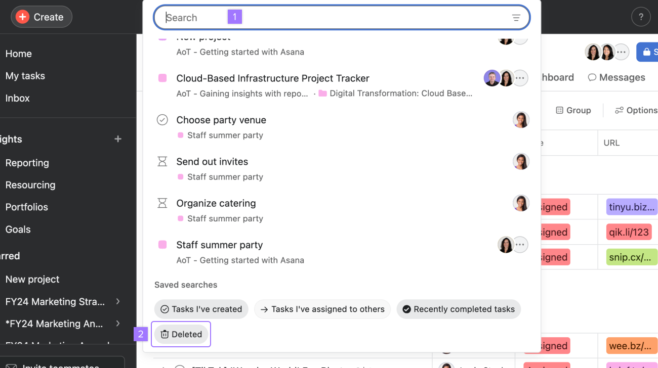 Cuando eliminas un elemento en Asana, recibirás una notificación en la parte inferior izquierda de la pantalla para informarte que se eliminó algo. La notificación contiene un botón para deshacer, por lo que si eliminas algo por accidente, puedes recuperarlo de inmediato. Sin embargo, debes actuar rápido, ya que la notificación solo aparece durante unos 15 segundos. Si no la encuentras, prueba con una búsqueda avanzada con el filtro Eliminado activo.