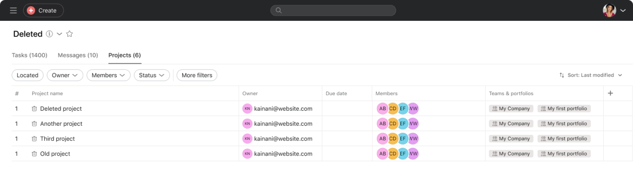 La vista Elementi eliminati su Asana è lo spazio dedicato agli elementi che sono stati rimossi dal tuo spazio di lavoro, e offre un ambiente controllato per la revisione e il recupero. Questa esperienza garantisce che il tuo lavoro eliminato sia accessibile per un periodo di tempo limitato, dandoti la possibilità di ripristinarlo.
