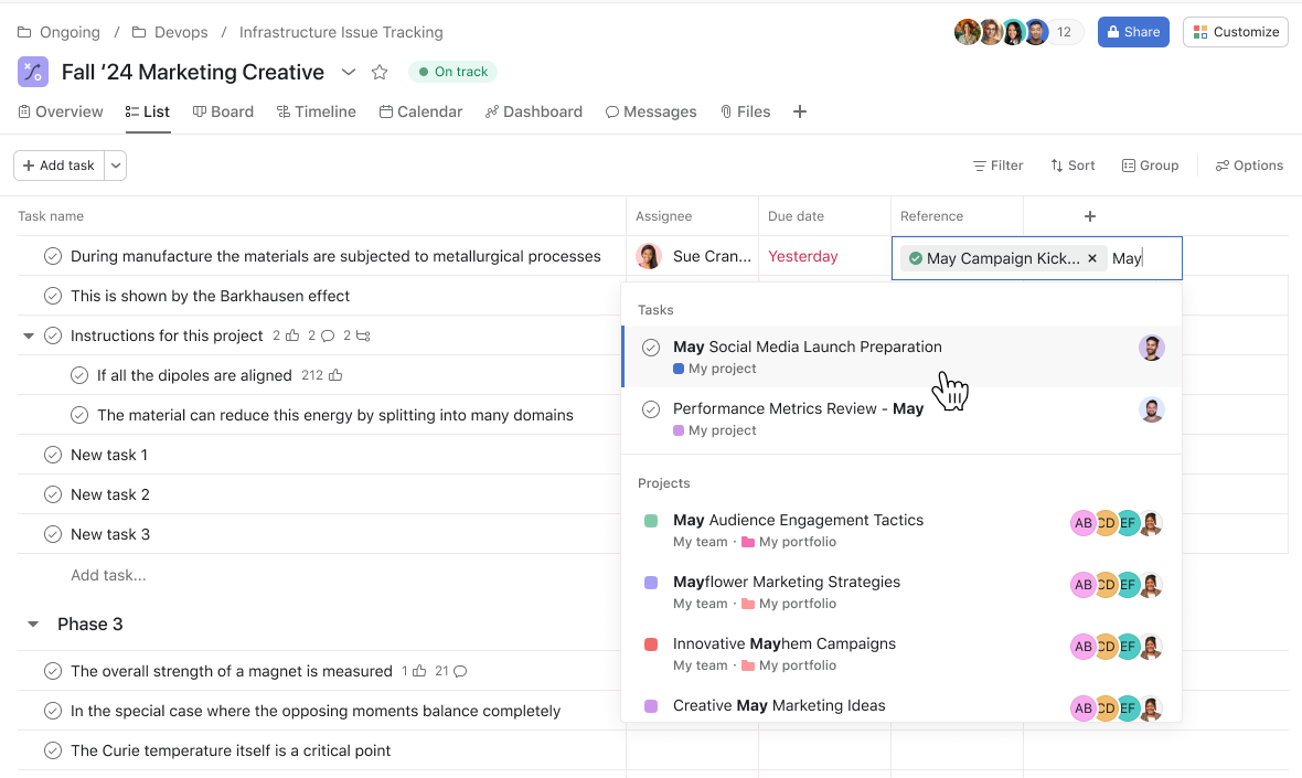 Reference custom fields allow you to create more meaningful relationships between tasks, projects, portfolios, and goals in a custom field–making it easy to track relationships and dependencies across your work.. You can add a reference custom field to tasks, projects, and portfolios. By referencing relevant work, you can improve visibility and collaboration across your workflows.