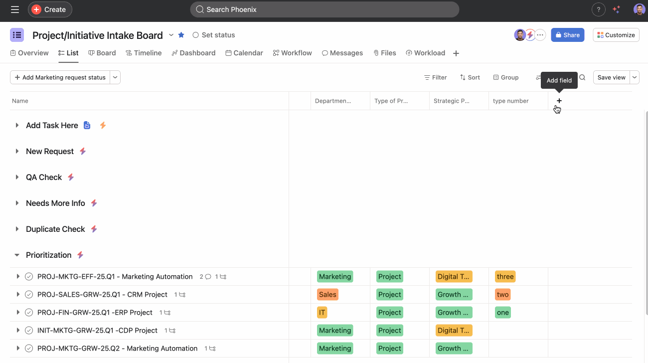 - Click the + button next to the column headers in list view, or select Customize and then Fields