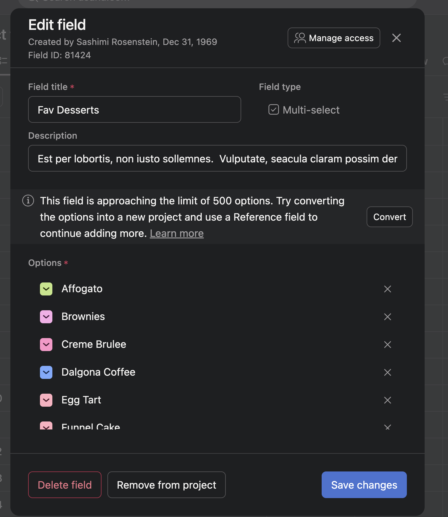 - If the field is at or approaching the field options limit, you will see a banner with a Convert button that allows you to convert the existing field to a reference custom field and an associated project.