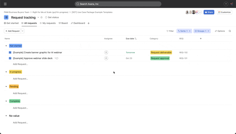 Esta plantilla usa un formulario para la recepción de solicitudes. Abre el borrador del formulario en Personalizar y envía una solicitud de prueba para ver lo que verán los remitentes. Después de enviarla, ve a la pestaña Todas las solicitudes para ver tu solicitud en el proyecto.