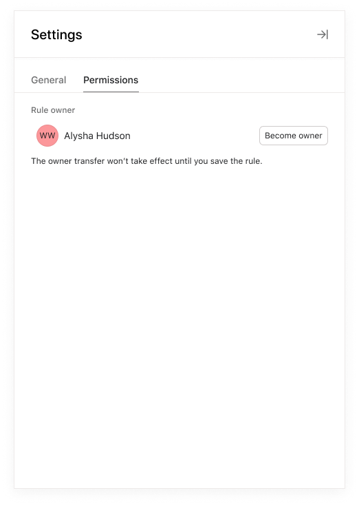 Users with access to edit workflows can claim ownership of a rule by navigating to the rule’s Settings tab and clicking Become owner. The current rule owner will receive an email and inbox notification letting them know the ownership of the rule has changed.