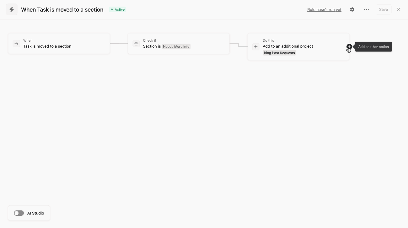 Under General settings, you can manage the name of the rule. You can also choose whether the rule can be triggered by other rules, and whether the rule should run on subtasks.